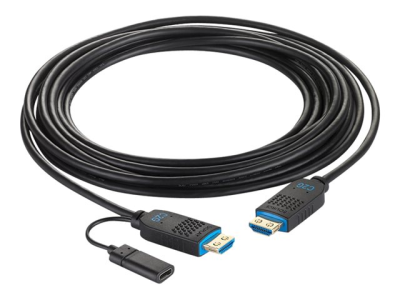 C2G Performance Series High-Speed HDMI Active Optical Cables (AOC) are the perfect solution for extending HDMI signals in classrooms, meeting spaces, and other commercial applications requiring high speed HDMI features and video resolutions up to 4K (4096 x 2160) at 60Hz. The cables fiber strand construction reduces the risk of EMI/RFI, making performance stable when used in high interference environments such as data centers, surgical theaters, or manufacturing facilities where high resolution and consistent displays are critical. HDMI AOCs have been engineered with quality components to give a robust design and enhanced performance, ideal for installation needs that are beyond the length limitations of standard HDMI copper cabling. Adding a thicker wire gauge and Kevlar, the cables have been improved with pull strength and overall structural integrity. The shielding in these cables optimizes the EMC, preventing unwanted electromagnetic interference and electrostatic discharges, contributing to the long-term reliability of the connected system. The cable jacket meets the fire code requirements for installation within plenum spaces, like a dropped ceiling. The AOC draws power from the HDMI source device. If additional power is needed, an integrated USB-C power pigtail is included on the display end to offer an external power option to maximize compatibility. The use of HDMI 2.1 grade components in the cable confidently improves the operation of HDMI 2.0 applications enhancing video experiences with higher resolutions, increased speeds, and sharper images at distances far beyond traditional HDMI cabling. Extensive compatibility and verification tests have been done with various source devices and displays to validate that these HDMI AOCs will withstand real-world applications and scenarios. HDMI AOCs can only run in one direction. The connectors have molded labeling for source and display, so there is no confusion with this directional cable. The source connector end even has a tag on the cable as an extra reminder.