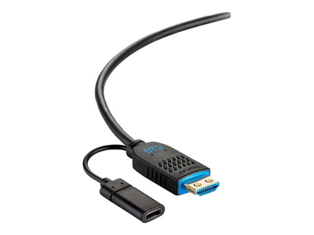 C2G Performance Series High-Speed HDMI Active Optical Cables (AOC) are the perfect solution for extending HDMI signals in classrooms, meeting spaces, and other commercial applications requiring high-speed HDMI features and video resolutions up to 4K (4096 x 2160) at 60Hz. The cables fiber strand construction reduces the risk of EMI/RFI, making performance stable when used in high interference environments such as data centers, surgical theaters, or manufacturing facilities where high-resolution and consistent displays are critical. HDMI AOCs have been engineered with quality components to give a robust design and enhanced performance, ideal for installation needs that are beyond the length limitations of standard HDMI copper cabling. Adding a thicker wire gauge and Kevlar, the cables have been improved with pull strength and overall structural integrity. The shielding in these cables optimizes the EMC, preventing unwanted electromagnetic interference and electrostatic discharges, contributing to the long-term reliability of the connected system. The cable jacket meets the fire code requirements for installation within plenum spaces, like a dropped ceiling. The AOC draws power from the HDMI source device. If additional power is needed, an integrated USB-C power pigtail is included on the display end to offer an external power option to maximize compatibility. The use of HDMI 2.1 grade components in the cable confidently improves the operation of HDMI 2.0 applications enhancing video experiences with higher resolutions, increased speeds, and sharper images at distances far beyond traditional HDMI cabling. Extensive compatibility and verification tests have been done with various source devices and displays to validate that these HDMI AOCs will withstand real-world applications and scenarios. HDMI AOCs can only run in one direction. The connectors have molded labeling for source and display, so there is no confusion with this directional cable. The source connector end even has a tag on the cable as an extra reminder.