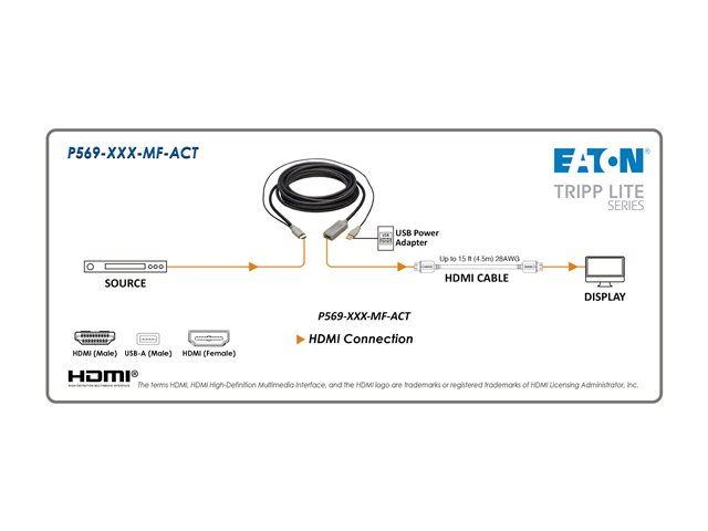 Eaton Tripp Lite Series HDMI-forlængerkabel med aktiv repeater er en pålidelig løsning til at forlænge HDMI-forbindelser og samtidig bevare videosignaler i høj kvalitet. Dette 15 fod lange kabel understøtter 4K-opløsning ved 60 Hz og HDR, hvilket sikrer levende og klare billeder. Det er konstrueret med PVC-kappe og har et guldbelagt stik for at forbedre ledningsevnen og reducere signaltab. Aktiv repeater-teknologi giver robust signalstyrke, hvilket gør det velegnet til udvidede opsætninger uden at gå på kompromis med ydeevnen. Dette kabel overholder RoHS-, WEEE-, REACH-, UKCA- og FCC-standarderne, hvilket sikrer miljøsikkerhed og kvalitet.