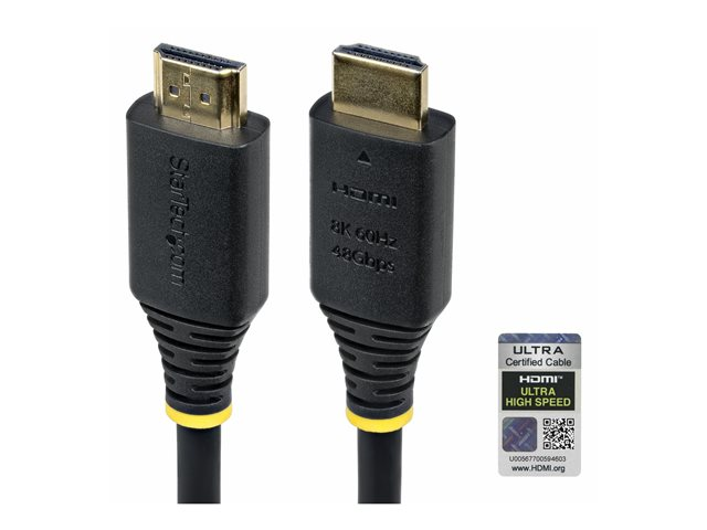 The StarTech.com HDMI 8K cable accommodates advanced audio and visual needs, ensuring every cinematic experience is clear. With support for 8K at 60Hz and 4K at 120Hz, this HDMI cable enables high-resolution video with clarity. Its flexible design allows for easy routing in tight spaces, and the aluminum mylar foil shielding provides protection against interference, maintaining a high-quality signal. Featuring Dolby Vision and a range of surround sound formats, including Dolby Atmos and DTS:X, this cable meets the demands for audio and video performance. The robust construction and gold-plated connectors offer durability and longevity, with a 10,000 insertions lifespan and 3,000 bend lifespan, making it a reliable choice for consistent usage.