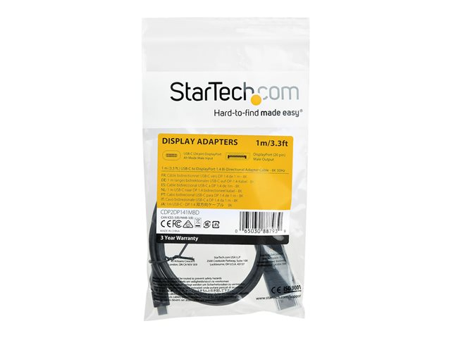 StarTech.com 3ft/1m USB C to DisplayPort 1.4 Cable 8K 60Hz/4K, Bidirectional DP to USB-C or USB-C to DP Reversible Video Adapter Cable, HBR3/HDR/DSC, USB Type C/Thunderbolt 3 Monitor Cable - 8K USB-C to DP Cable (CDP2DP141MBD) - DisplayPort kabel - USB-C (han) til DisplayPort (hun) - USB 3.1 / Thunderbolt 3 / DisplayPort 1.4 - 1 m - aktiv, 8K UHD (7680 x 4320) support - sort CDP2DP141MBD