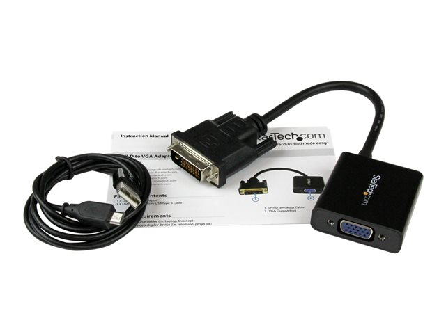 This portable adapter works to convert a standard powered DVI bus to VGA, without an external power source. For low-powered DVI ports, a USB cable is included that can power the device from any USB power source.