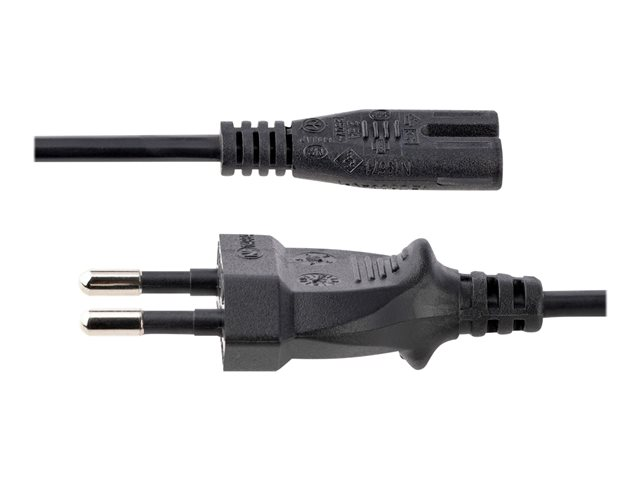 The StarTech.com 2m (6ft) Laptop Power Cord is a reliable replacement or backup for your laptop charging needs. Designed with durability and safety in mind, it features an 18AWG PVC jacket and a non-polarized connector with strain relief. This ensures a secure connection while reducing the risk of wear and tear over time. The cable meets several safety standards, including RoHS, VDE, VW-1, and WEEE, offering peace of mind with every use. With its Europlug to IEC 60320 C7 connectors, it provides versatile compatibility with a variety of devices such as laptops, notebooks, printers, and power bricks. Rated for 2.5 A and AC 250 V, it ensures a reliable power supply to keep your devices running smoothly. Suitable for use at home, in the office, or while on-the-go, this laptop charger cable is a practical accessory for today's digital world.