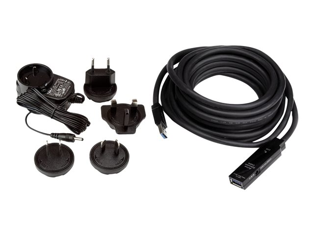 An all in one cable for overcoming distance restrictions as well as power source limitations; the active USB 3.0 extension cable incorporates bus powered active circuitry to ensure performance beyond the length limits of standard USB cables. Up to 4 of these cables can be daisy-chained together, allowing the connection to be extended a total of 20-meters. If necessary, the USB device can be powered from a wall outlet using the Universal AC power adapter provided with the cable.