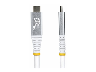 The StarTech.com USB-C cable provides robust performance for a range of devices, offering support for USB4, Thunderbolt, and DisplayPort 2.1 standards. With a data rate of 80 Gbps, this coaxial cable delivers high-quality connectivity for both data and power needs. It features HDR support, including HDR10 and HDR10+, ensuring vibrant visuals with broad color depth. Additionally, the cable accommodates up to 32 audio channels for sound quality in multimedia applications.