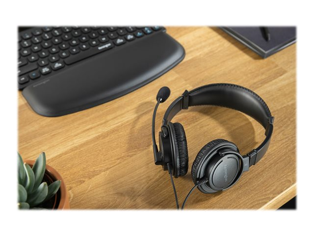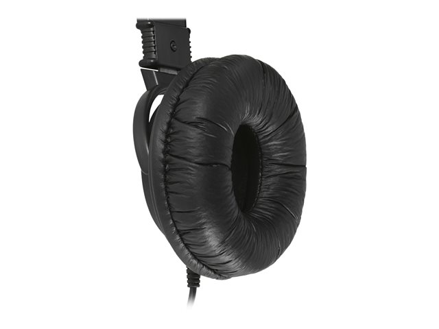 • Designed to fit all ages for universal comfort, the adjustable headband is padded, the flexible boom-style microphone can be rotated up to 270 degrees, and the foam ear pads are wrapped in a soft leatherette cover to provide hours of comfortable use