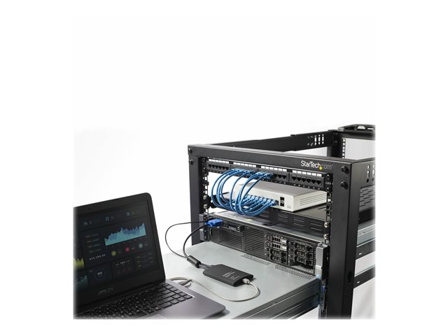 Laptop KVM Server Console Adapter sikrer fuld kontrol over de tilsluttede enheder og giver øjeblikkelig adgang til POST-skærmen og BIOS, plus muligheden for at håndtere fuld konfiguration af den tilsluttede pc eller maskine; administratorer kan oprette forbindelse til en headless server/enhed uden behov for en dyr LCD-rackmount-konsol eller pladskrævende skærm-, tastatur- og museløsning.