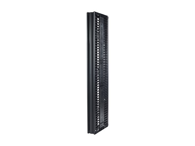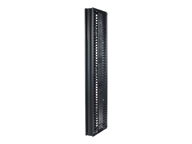 This 6" wide, high capacity vertical cable manager for 2 and 4 post open frame racks features a double-sided cable channel with multiple internal cable tie-off locations and smooth plastic fingers at 1 U increments for organized patching applications.