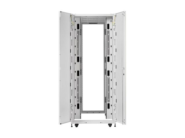 Eaton SmartRack 42U Deep Extra-Wide Heavy-Duty Rack Enclosure Cabinet er designet til opbevaring og beskyttelse af AI-servere. Dette rackkabinet er fremstillet af holdbart stål med pulverlakeret overflade og er robust og pålideligt. Med et dybt og ekstra bredt design tilbyder det rigelig plads til dit udstyr og har en vægtgrænse på op til 2268 kg. Sikkerheden og tilgængeligheden er forbedret med aflåselige funktioner og medfølgende nøgler, hvilket giver ro i sindet for værdifulde komponenter. Dette kabinet er udstyret med fire lodrette monteringsskinner, nivelleringsben og tunge hjul, hvilket letter organisering og flytning af dine enheder. Det kompatible design opfylder forskellige standarder, herunder EIA-310-E, RoHS, UL 2416 og UKCA, hvilket sikrer, at det opfylder kravene. Pakken indeholder flere sidepaneler og låse samt burmøtrikker og nylon skiver, der giver alt, hvad der er nødvendigt for en sikker installation.