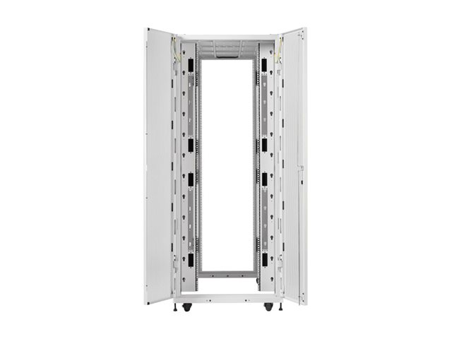 Eaton SmartRack 45U ekstra dybt og ekstra bredt rackkabinet til tungt udstyr er designet til at imødekomme kravene til AI-servere med sin robuste konstruktion og rummelige design. Kabinettet er fremstillet af kraftigt stål og kan aflåses for ekstra sikkerhed, så vigtigt udstyr forbliver beskyttet. Det har fire lodrette monteringsskinner og er udstyret med nivelleringsben og hjul for nem mobilitet og stabilitet, hvilket gør det velegnet til datacentre og professionelle miljøer. Desuden giver pulverlakeringen holdbarhed og et rent udseende, hvilket forbedrer funktionaliteten og det visuelle udtryk.