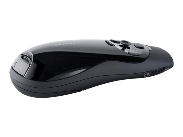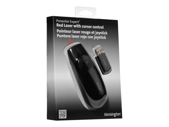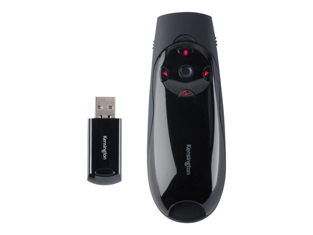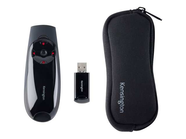 Take control of the room - and your computer's cursor - with the Kensington Presenter Expert red laser presenter with cursor control. The wireless presenter is the one you don't have to think about because everything is intuitive. The Kensington Presenter Expert is just that. Now you can focus on wowing your audience rather than focusing on the operation of your presenter. The simple four-button design makes it easy to navigate your Keynote or PowerPoint presentation. And the red laser helps you make your point from across the room. But sometimes pointing just isn't enough. That's where the Presentation Expert's cursor control comes into play. With a simple flick of a switch, you'll toggle between presentation and cursor control modes. The powerful 2.4 Ghz remote resists interference and lets you control Keynote or PowerPoint from up to 150 feet away. The USB receiver stores inside the presenter so you won't have to worry about losing it. Dark rooms can be a challenge for some wireless presenters. But the Kensington Presenter Expert has backlit buttons so you'll always find the correct button. There's also a low battery indicator to eliminate surprises. And the whole thing packs in a handy carrying pouch.