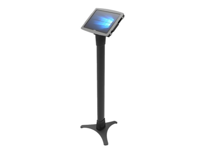 Our Adjustable stand can be set to various heights: 39" - 45" / 100cm - 115cm and the mount allows the tablet enclosure to be set in either portrait or landscape mode. Designed for maximum stability with a heavy steel base that provides cable management through the stand itself. Below the enclosure is a small storage area to hold the charging unit of the tablet