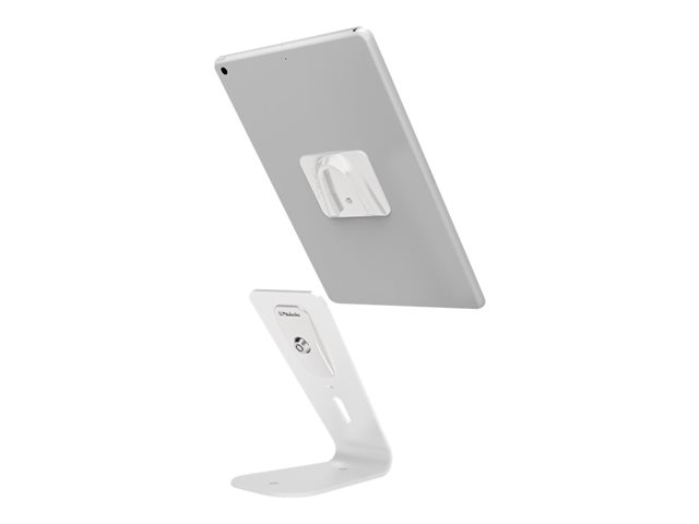 HoverTab Security Stand - Universal Display Lockable stand for any Tablet or Smartphone. The clean looking design Hover Tablet stand is a one of a kind product that can provide you with a simple clean way to securely display your tablet. The HoverTab is a two part system, the first being an adhesive steel plate that connects to the back of the iPad, Galaxy Tab or smartphone. The second is the six inch high stand, sloped at a 60 degree angle for an optimal viewing angle and has 4 inch base for stabilized balance no matter the connected device.