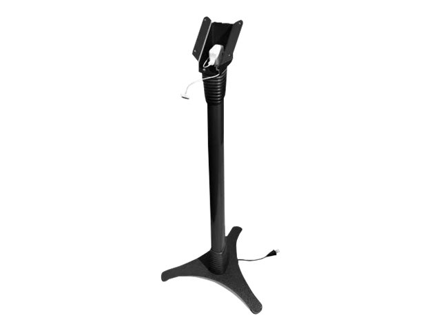Our Adjustable stand can be set to various heights: 39" - 45" / 100cm - 115cm and the mount allows the tablet enclosure to be set in either portrait or landscape mode. Designed for maximum stability with a heavy steel base that provides cable management through the stand itself. Below the enclosure is a small storage area to hold the charging unit of the tablet