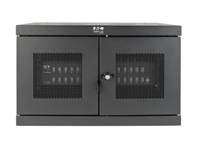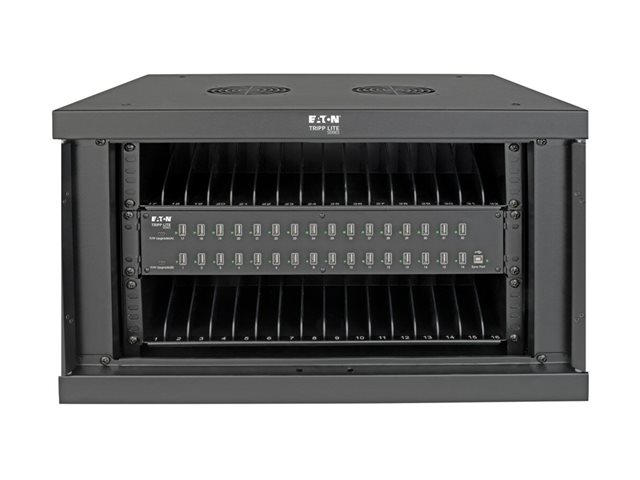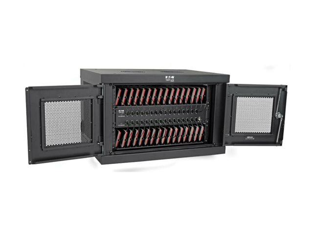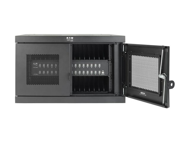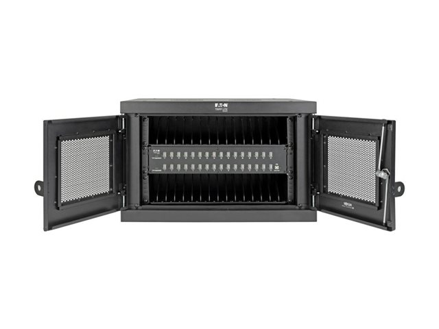 Eaton Tripp Lite Series 32-Device USB Charging Station Cabinet er en omfattende opladningsløsning, der er designet til at opfylde behovene i miljøer som skoler, kontorer og butikslokaler. Med kapacitet til at oplade op til 32 enheder samtidigt via sine USB-A-porte sikrer dette skabssystem effektiv energidistribution og enhedsstyring. Det alsidige design giver mulighed for både skrivebords- og vægmonterede opsætninger, hvilket giver fleksibilitet i placeringen alt efter pladsforhold og brugerpræferencer. Sikkerheden er prioriteret med en nøglelås og en låsbar frontdør, der beskytter enhederne under opladning. Kabinettet er fremstillet af holdbart stål med en elegant sort pulverlakeret finish og er ikke kun robust, men passer også perfekt ind i ethvert professionelt miljø. Yderligere funktioner som EMI- og RFI-filtrering, hurtig opladning og et omfattende monteringssæt gør det til et vigtigt værktøj til sikker og effektiv håndtering af flere enheder.