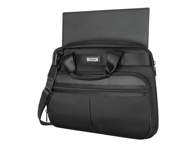 Prepare for a productive workday while protecting your tech with the Targus 13 - 14" Mobile Elite slimcase. This case features a single, padded main compartment that shields your laptop from everyday bumps and scratches while keeping documents or magazines handy, and two front pockets for accessory storage. Slimmer than a briefcase and roomier than a sleeve, the case also includes a removable shoulder strap and soft grip handles.