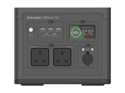 The APC Schneider OffGrid 730 portable power station offers versatile and reliable energy storage with a robust lithium-ion battery boasting a capacity of 738 Wh. It features a recharge time of 9 hours, ensuring quick readiness for outdoor adventures or emergency situations. Designed with user convenience in mind, the unit includes various output options such as three USB-A ports, two USB-C ports, and a wireless charger, providing flexibility for all types of devices. This power station delivers a maximum output of 700 watts, making it suitable for various applications. It can operate efficiently in a wide range of temperatures, from -10°C to 40°C. The LCD display provides real-time information about power usage, ensuring users can monitor their energy consumption easily. Built with environmental conscientiousness, the product is made from 60% recycled plastic and complies with multiple standards including FCC Class B, RoHS, and cTUVus.